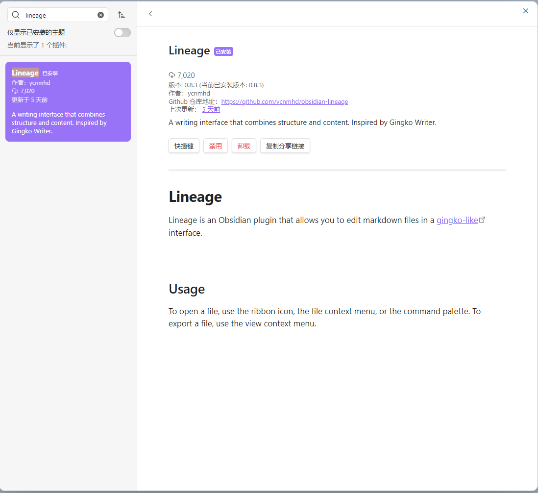 在 obsidian 的第三方插件中可以直接搜索到 lineage