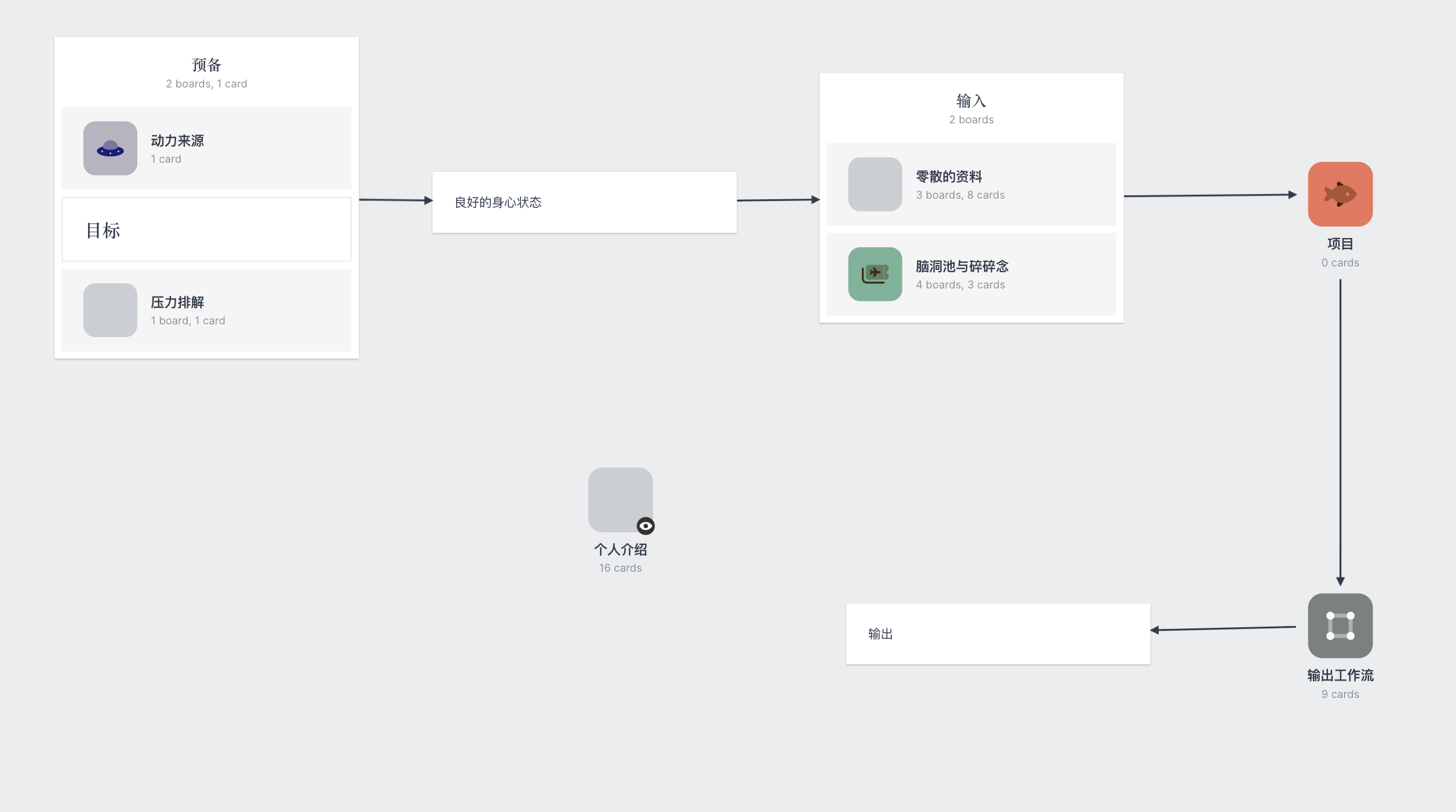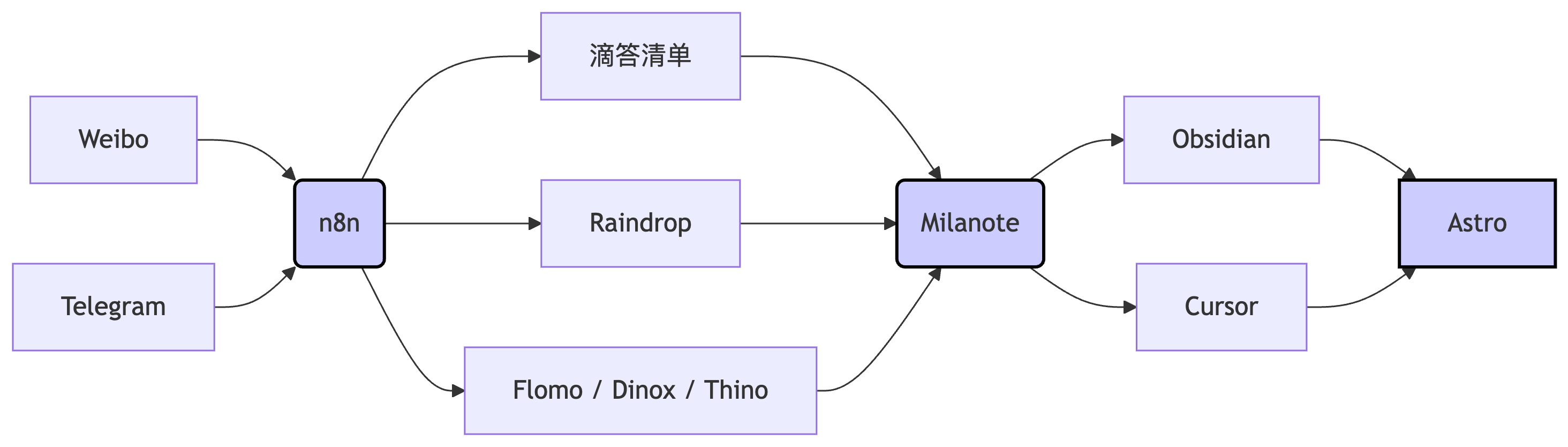 大体思路社交平台作为最随意的入口,通过 n8n + rss 定时获取内容调接口写入到 raindrop 和 子弹笔记里面(目前用 thino 比较多),然后用 milanote 筛选一层,然后记录比较详细的个人的脑洞和想法,然后输出为项目或者企划,做进一步详细规划。